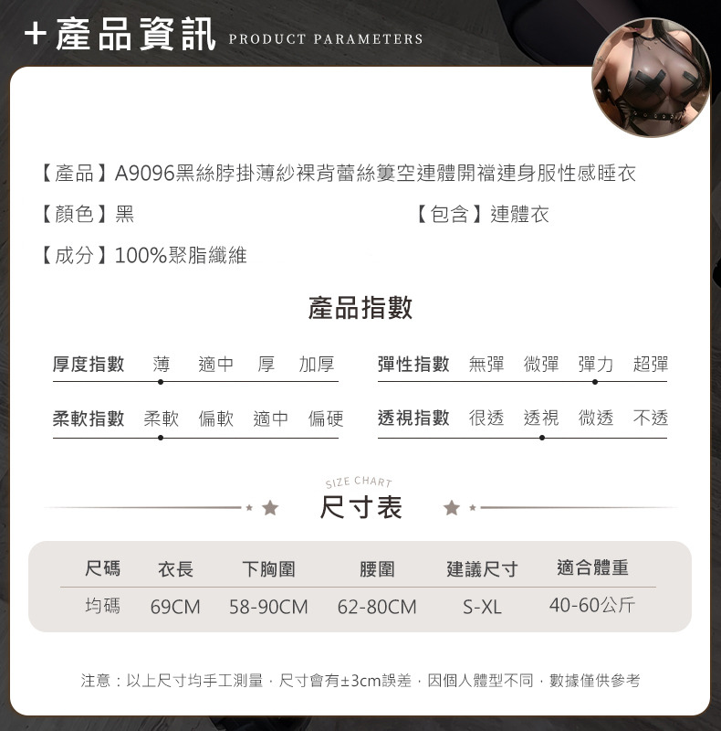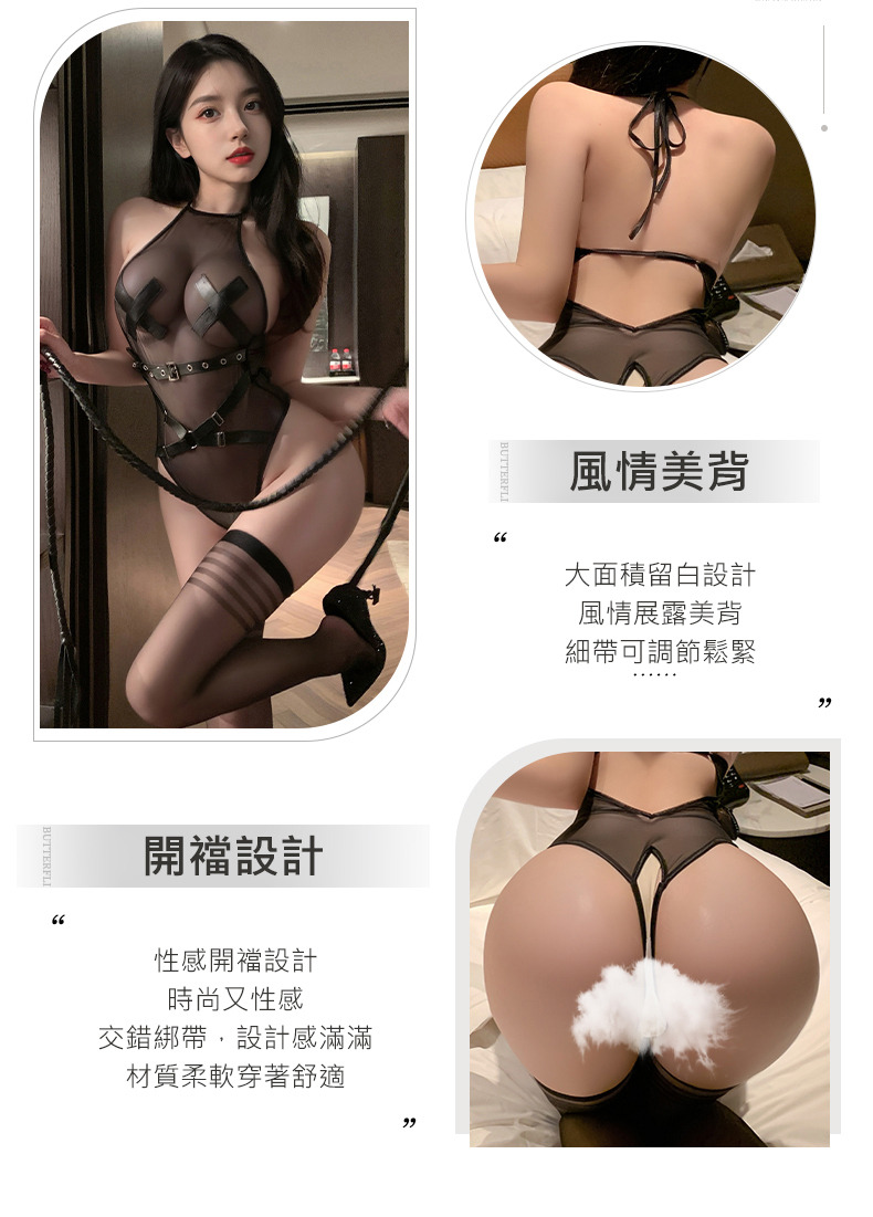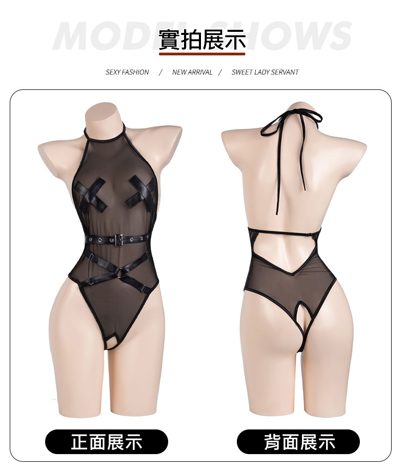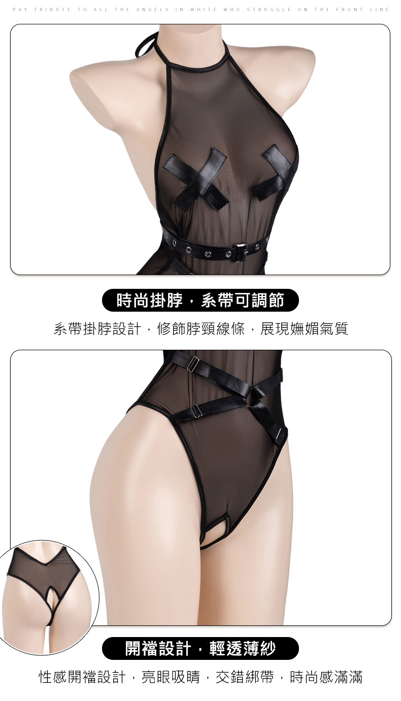 A9096黑絲脖掛薄紗裸背蕾絲簍空連體開襠免脫制服誘惑情趣內衣連身服性感睡衣(大腿襪)
